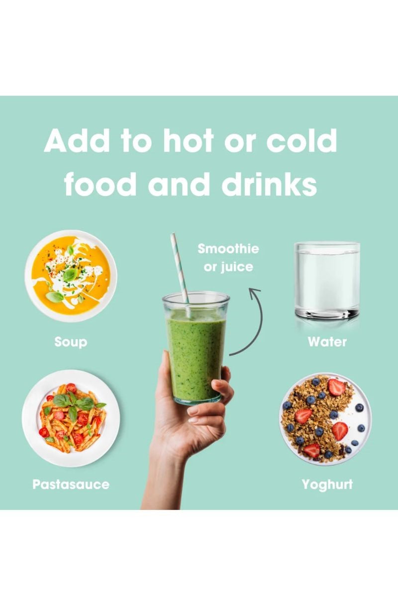 Can be added to (hot or cold) drinks or food without altering the taste, smell, color, or texture. Add it, for example, to water, yogurt, juice, pasta sauce, soup or a smoothie!