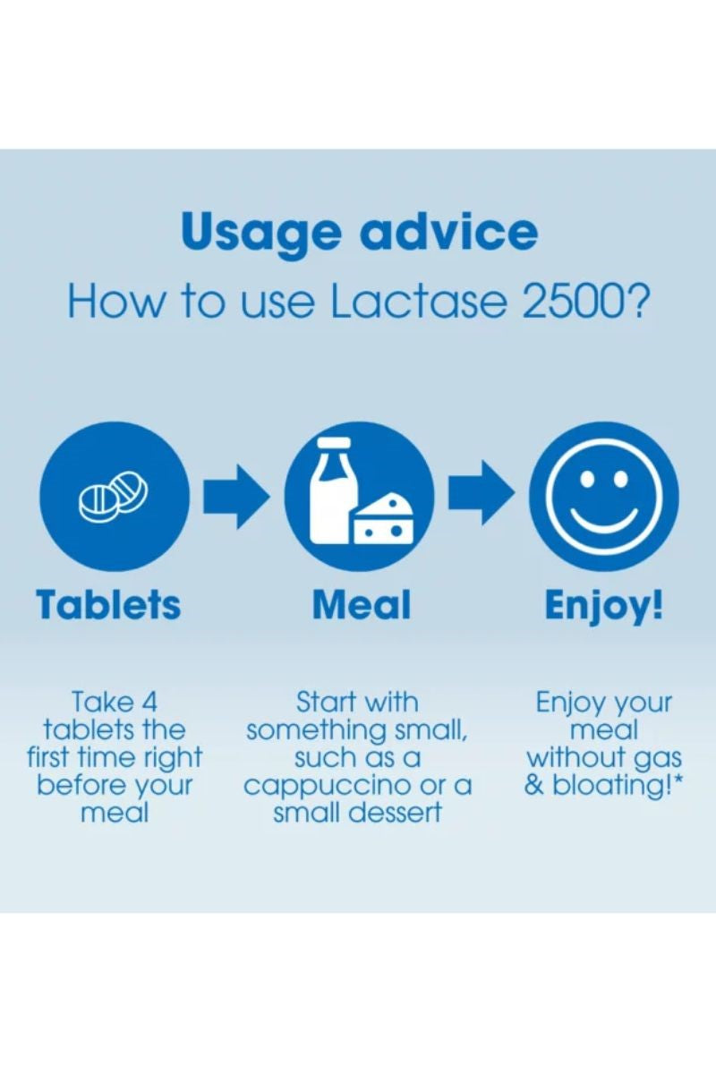 Lactase 2500 contains a lower dose of the lactase enzyme, ideal for mild lactose intolerance and for digesting small amounts of lactose.